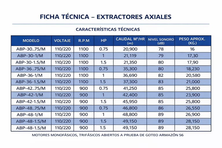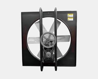 Los extractores axiales con transmisión por poleas y bandas están diseñados para aplicaciones industriales que requieren alto caudal de aire, flexibilidad operativa y trabajo continuo. El sistema de transmisión permite ajustar la velocidad de giro del impulsor según la relación de poleas, adaptándose a diferentes requerimientos de ventilación.